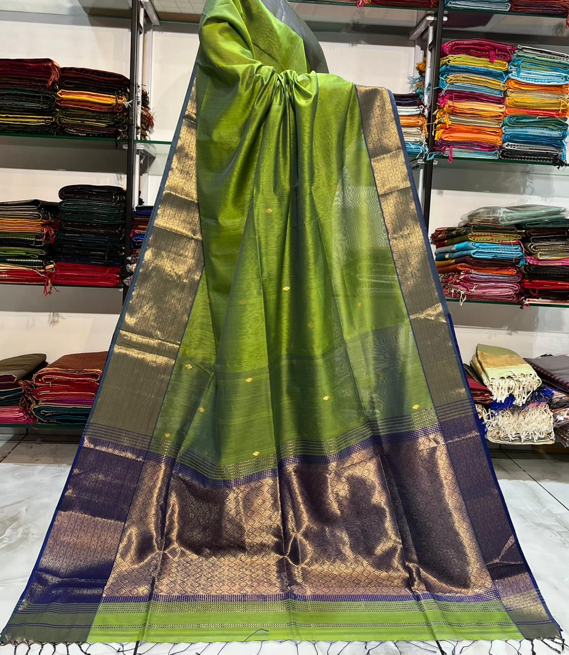 Stunning Parrot Green Maheshwari Silk Saree with rich purple border and intricate golden zari work. Perfect blend of traditional handloom craftsmanship and contemporary elegance.