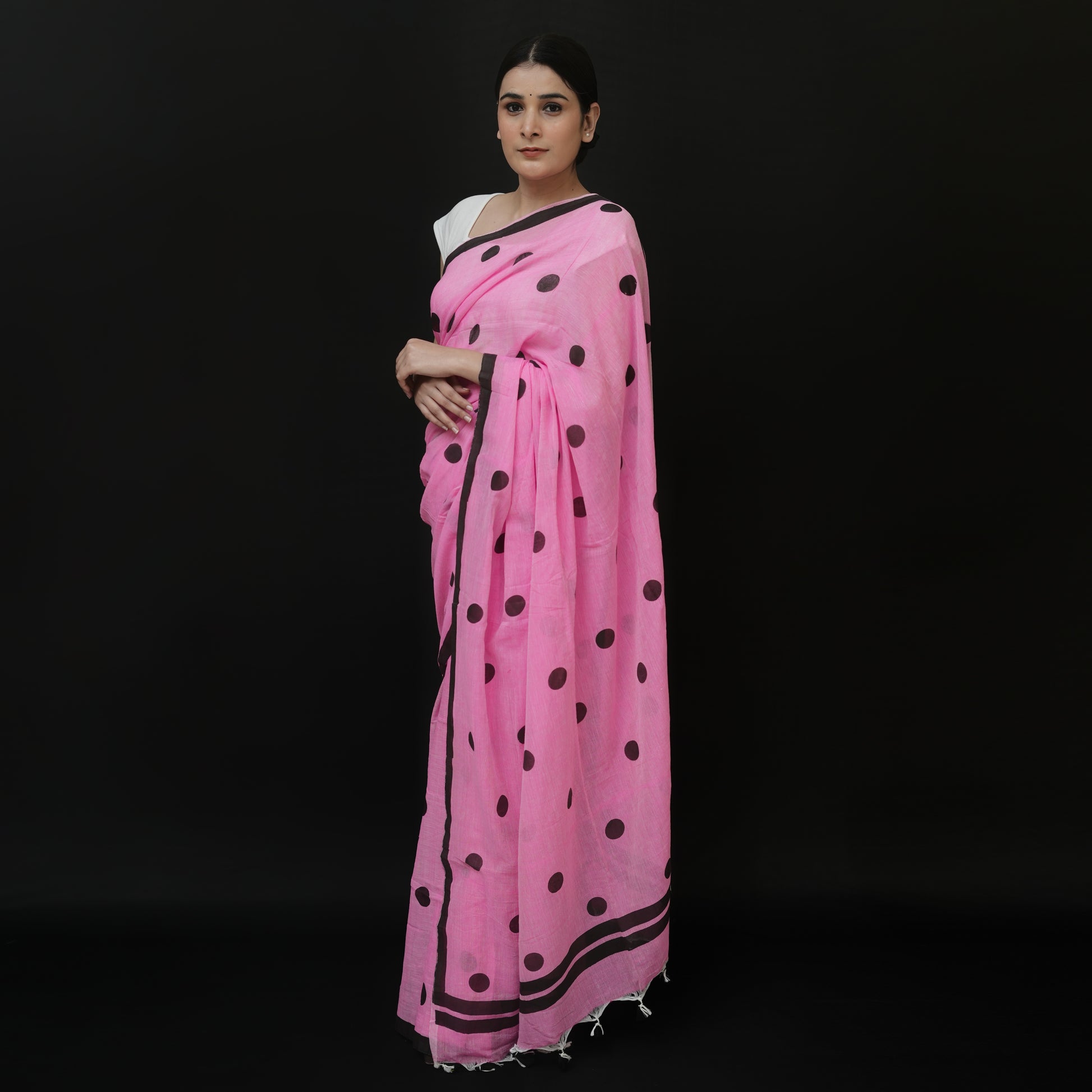 Elegant Baby Pink Polka Dot Printed Cotton Saree