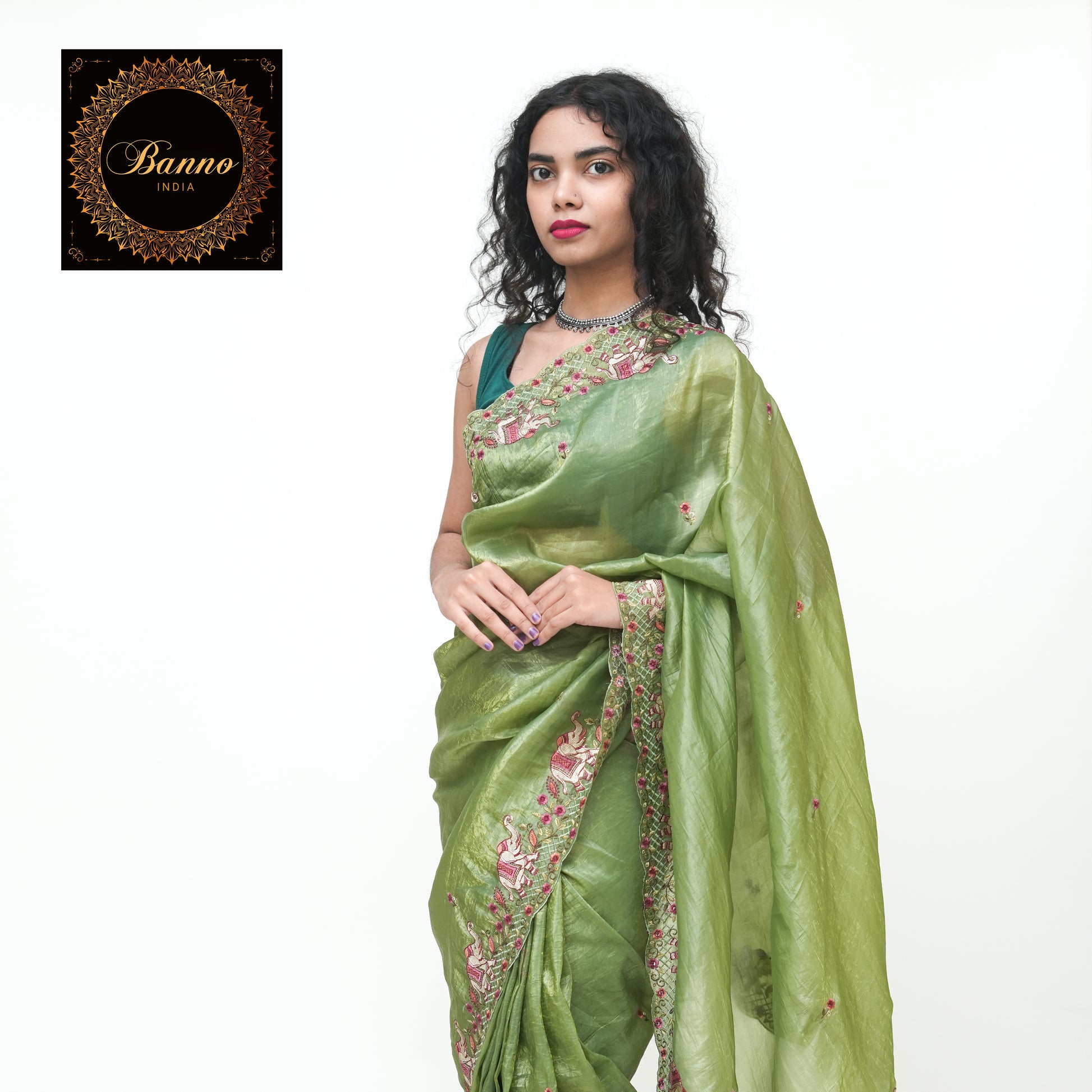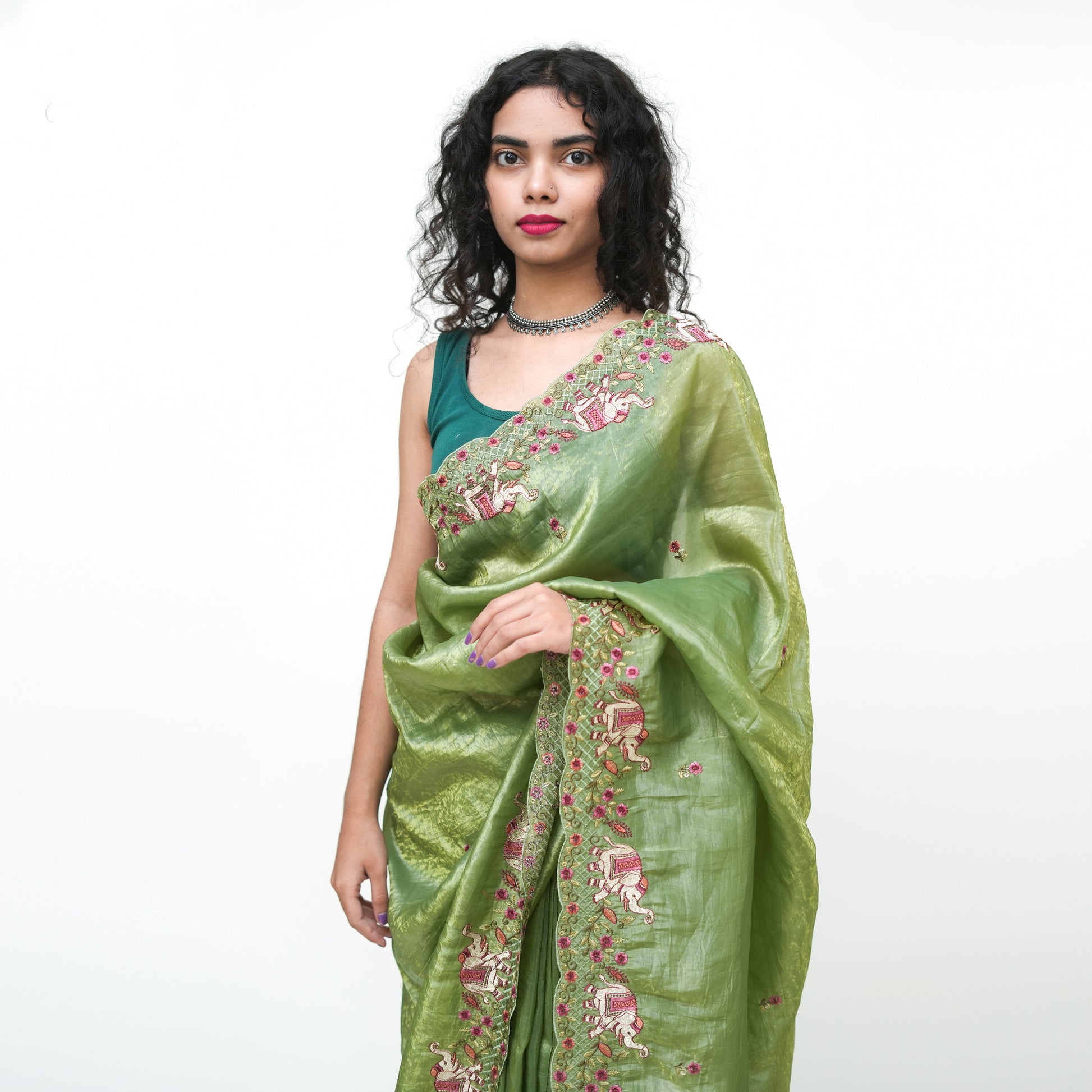Pure Green Tissue Saree with Embroidery and Blouse Piece